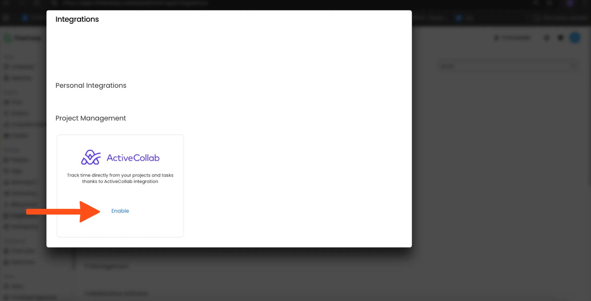 To enable the ActiveCollab integration, select the Integrations option in the left panel. Next, find the ActiveCollab integration on the list and click the Enable button.