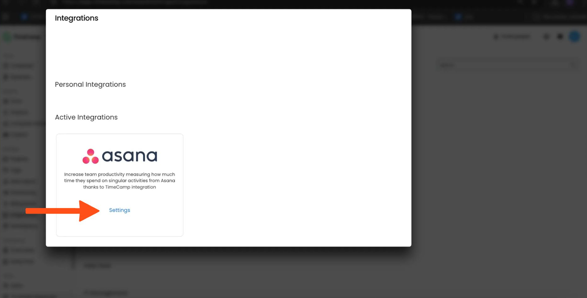 If for some reason you would like to reenable or unlink the integration, select the Integrations option in the left panel. Next, find the Asana integration on the list of active integrations and click on its Settings.