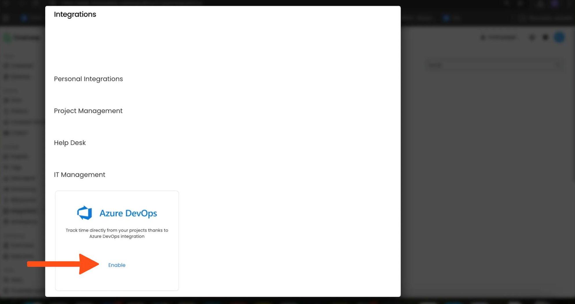 To enable the Azure DevOps integration, select the Integrations option in the left panel. Next, find the Azure DevOps integration on the list and click the Enable button.