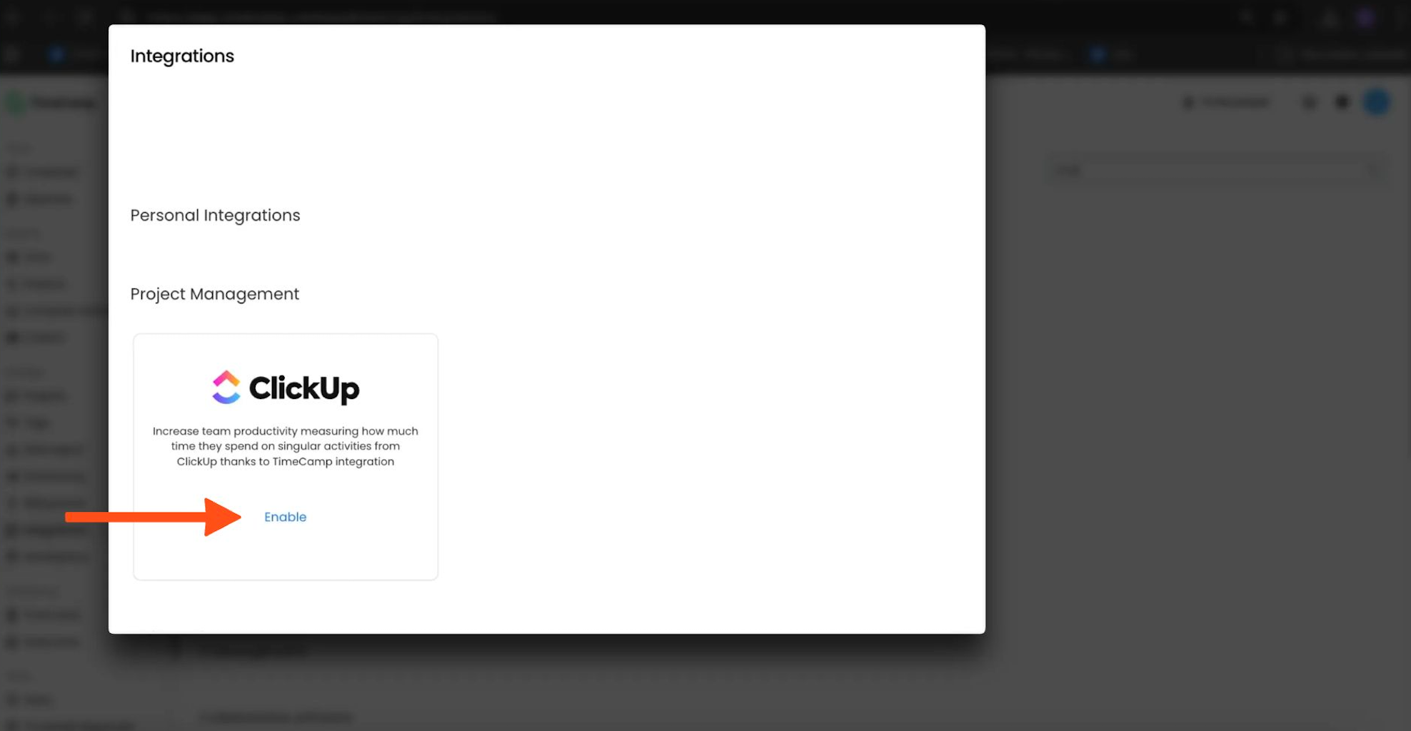 To enable the ClickUp integration, select the Integrations option in the left panel. Next, find the ClickUp integration on the list and click the Enable button.