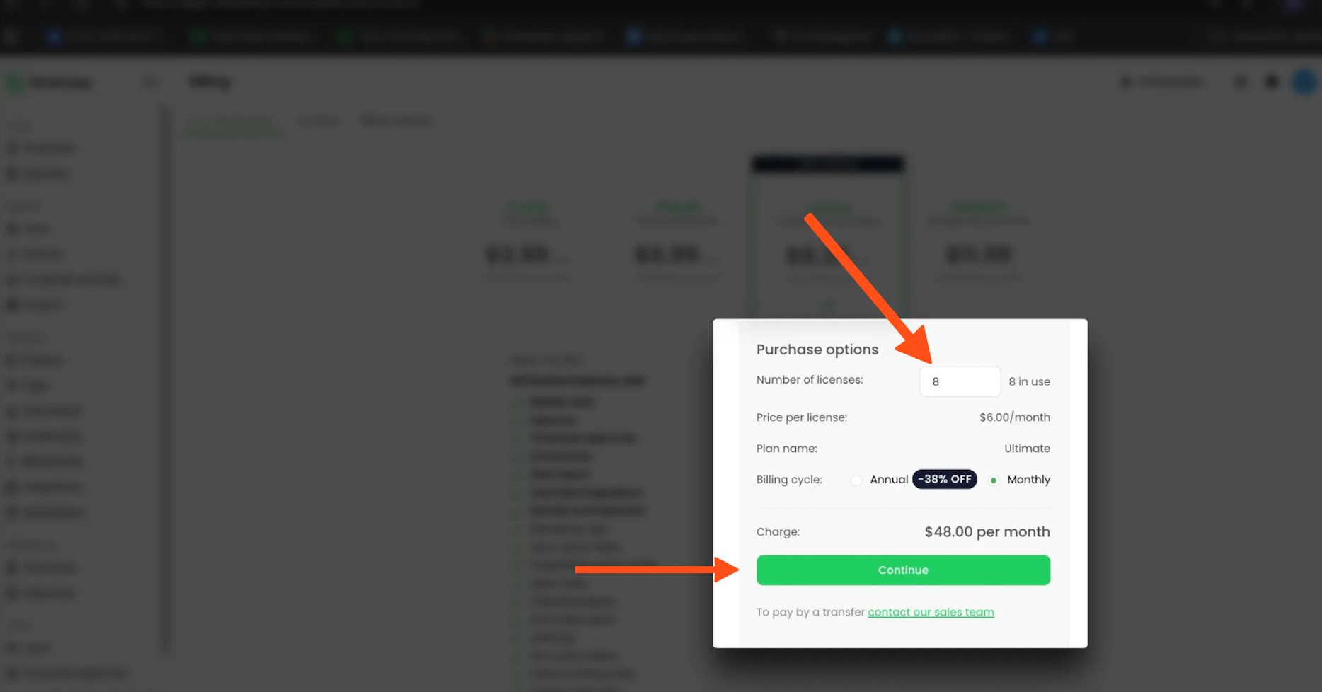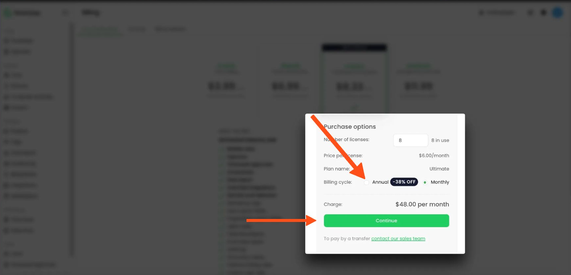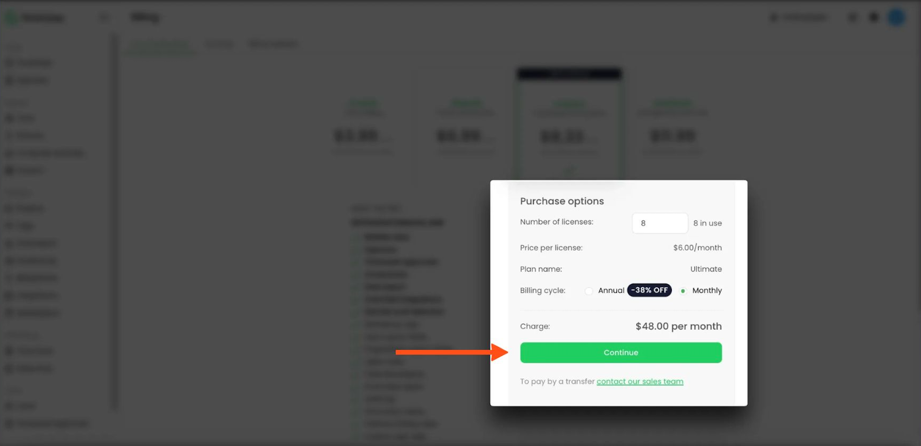 Please make sure that you selected the correct subscription plan, the number of seats, billing cycle, and click on the green Continue button.