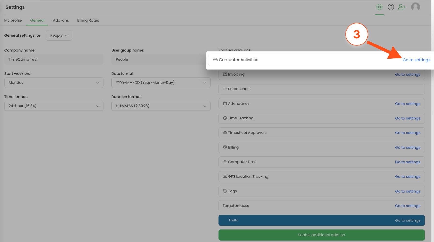 To track the computer time you need to adjust the settings on your web account. Click on your avatar in the upper-right corner and select the Account Settings option. You'll be redirected to the General tab where you can use the shortcut to get to the Computer Activities settings.