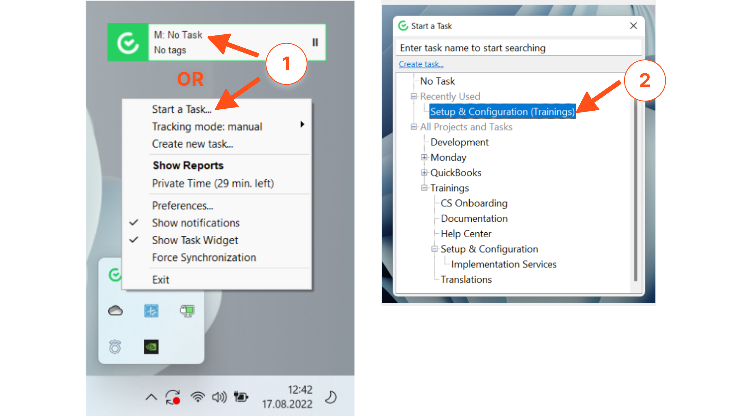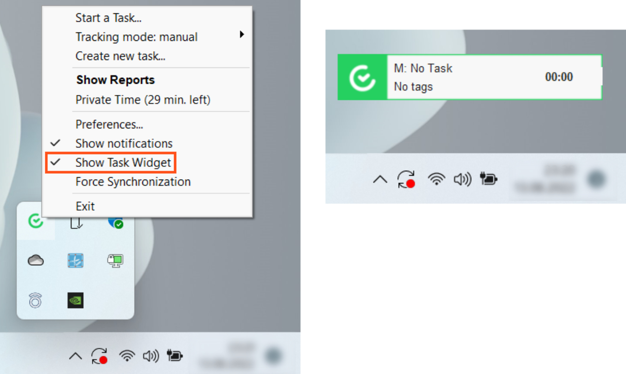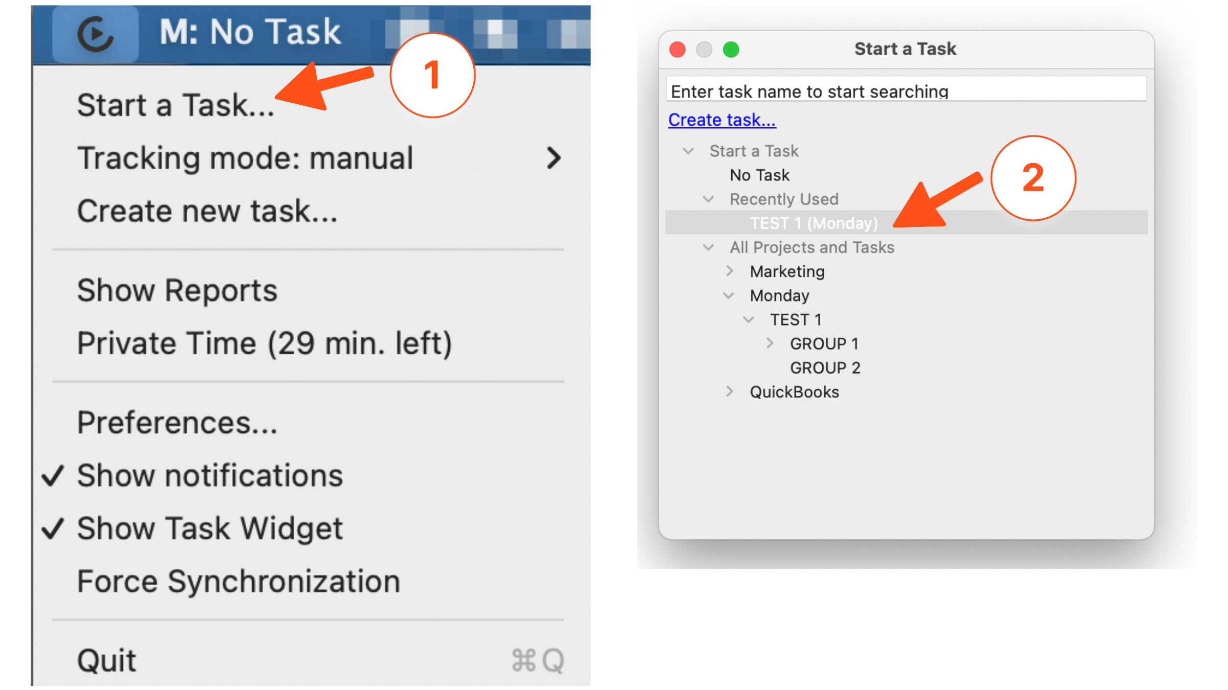If you’re using manual time tracking mode, simply click on the No task option from the widget or click on the option Start a Task from the desktop app menu to select a task and optionally assign tags. After selecting a task from the list timer will be started instantly. To stop tracking click on the Stop tracking option from the desktop app menu or click on the Stop icon on the task widget (for Windows).