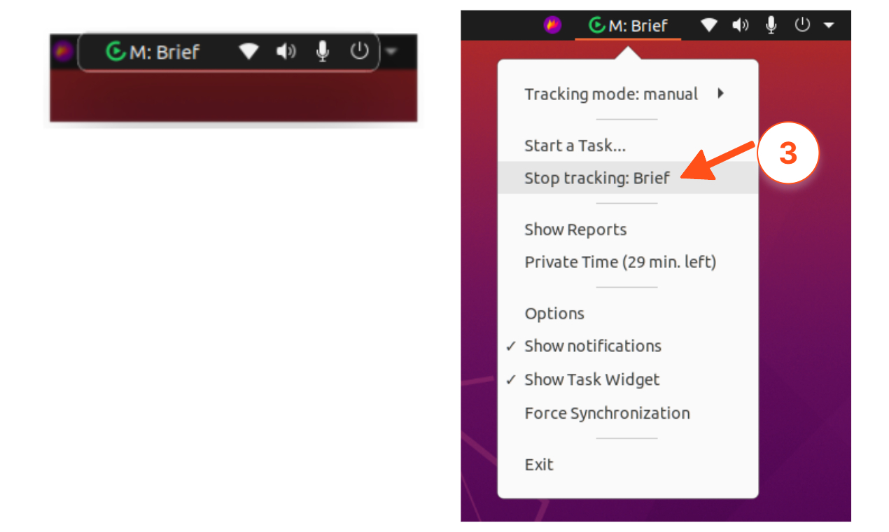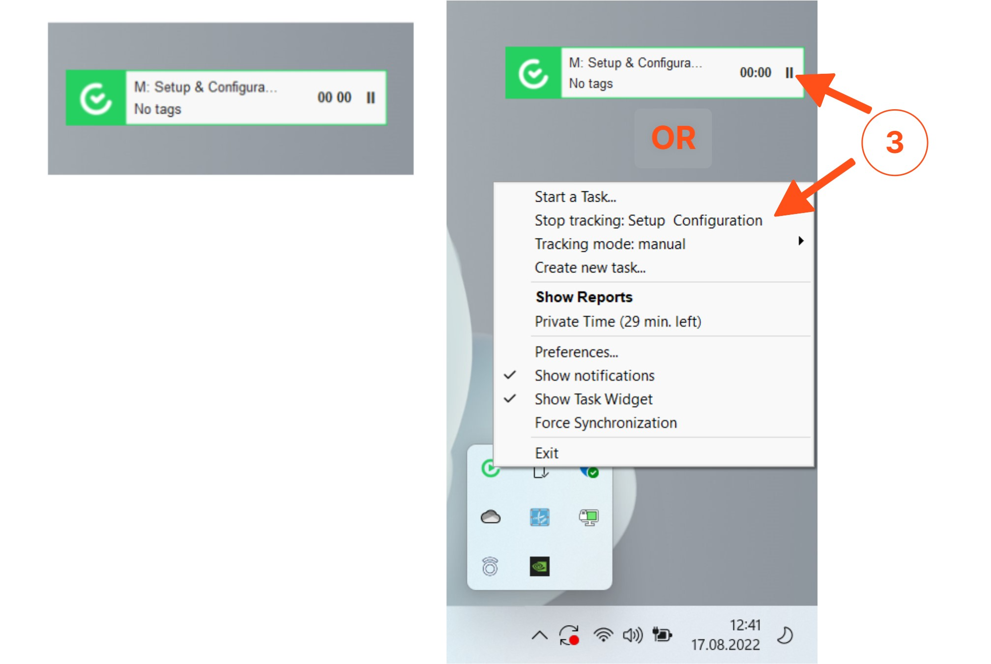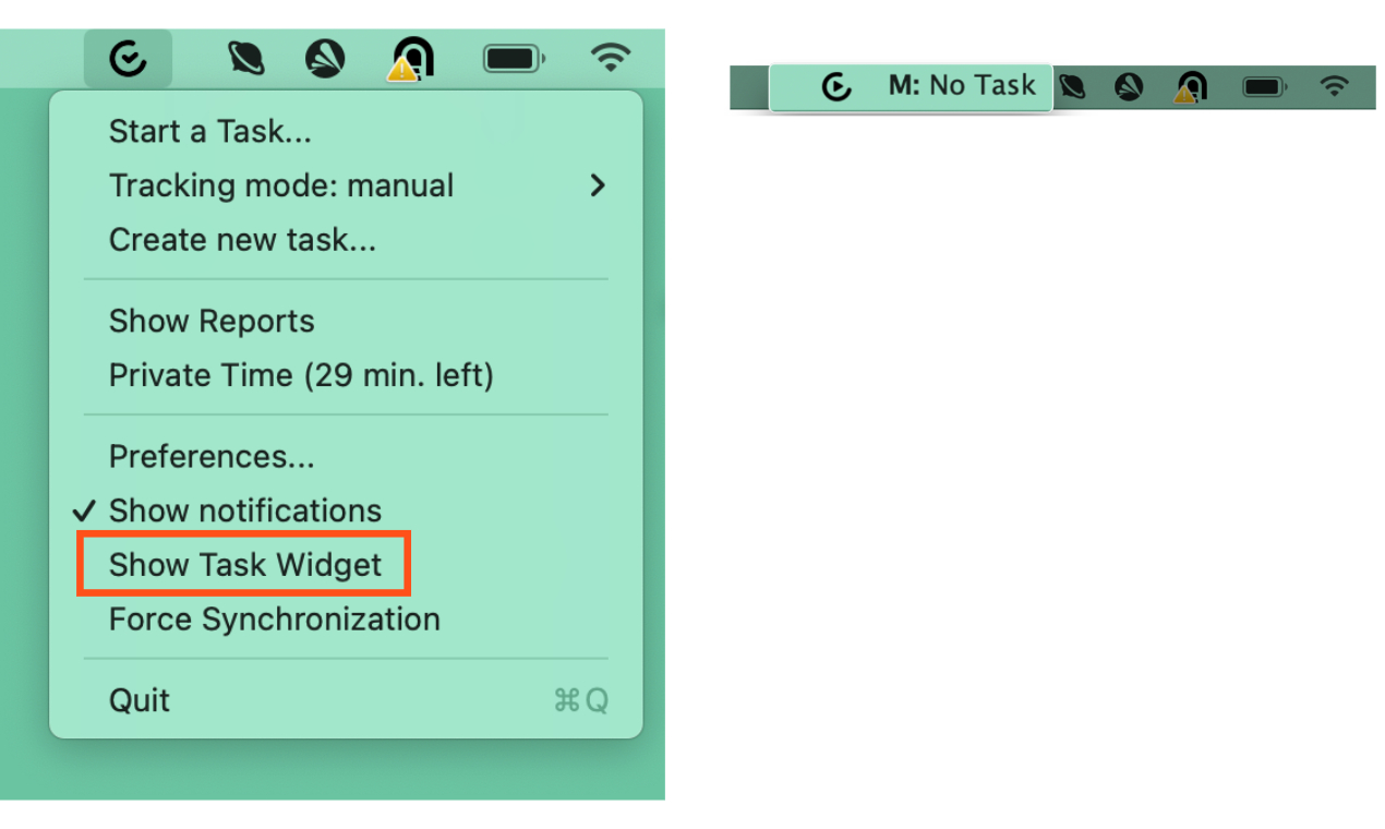 If you’re using manual time tracking mode, simply click on the No task option from the widget or click on the option Start a Task from the desktop app menu to select a task and optionally assign tags. After selecting a task from the list timer will be started instantly. To stop tracking click on the Stop tracking option from the desktop app menu or click on the Stop icon on the task widget (for Windows).