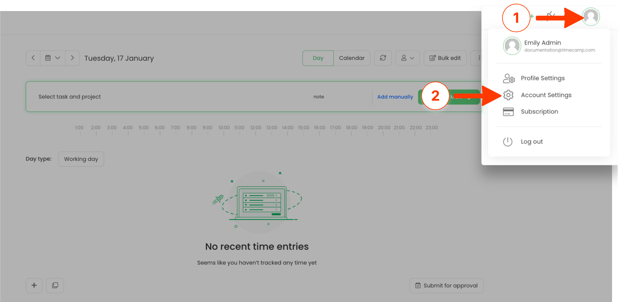 Here you can find the description of some settings that can help to organize your work and define time-tracking rules. Click on your avatar in the upper-right corner and select the Account Settings option. You'll be redirected to the General tab where you can use the shortcut to get to the Computer Activities settings.