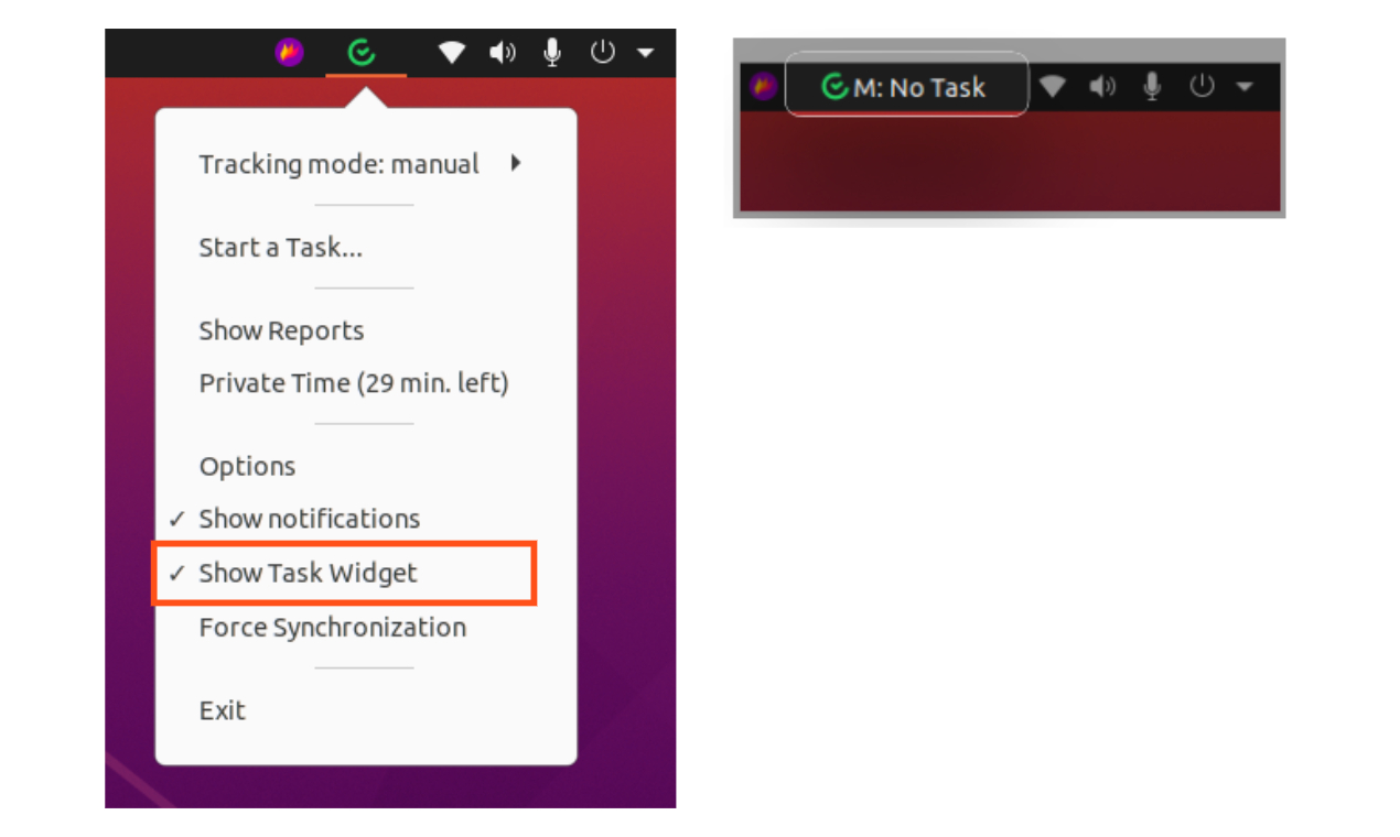 To start tracking time we recommend opening a task widget first. The task widget will allow viewing what exactly task and tags are currently selected. To add the Task Widget click on the TimeCamp icon (right-click for Windows) and mark the checkbox next to the Show Task Widget option. By default, this option is already enabled when you run the application for the first time.
