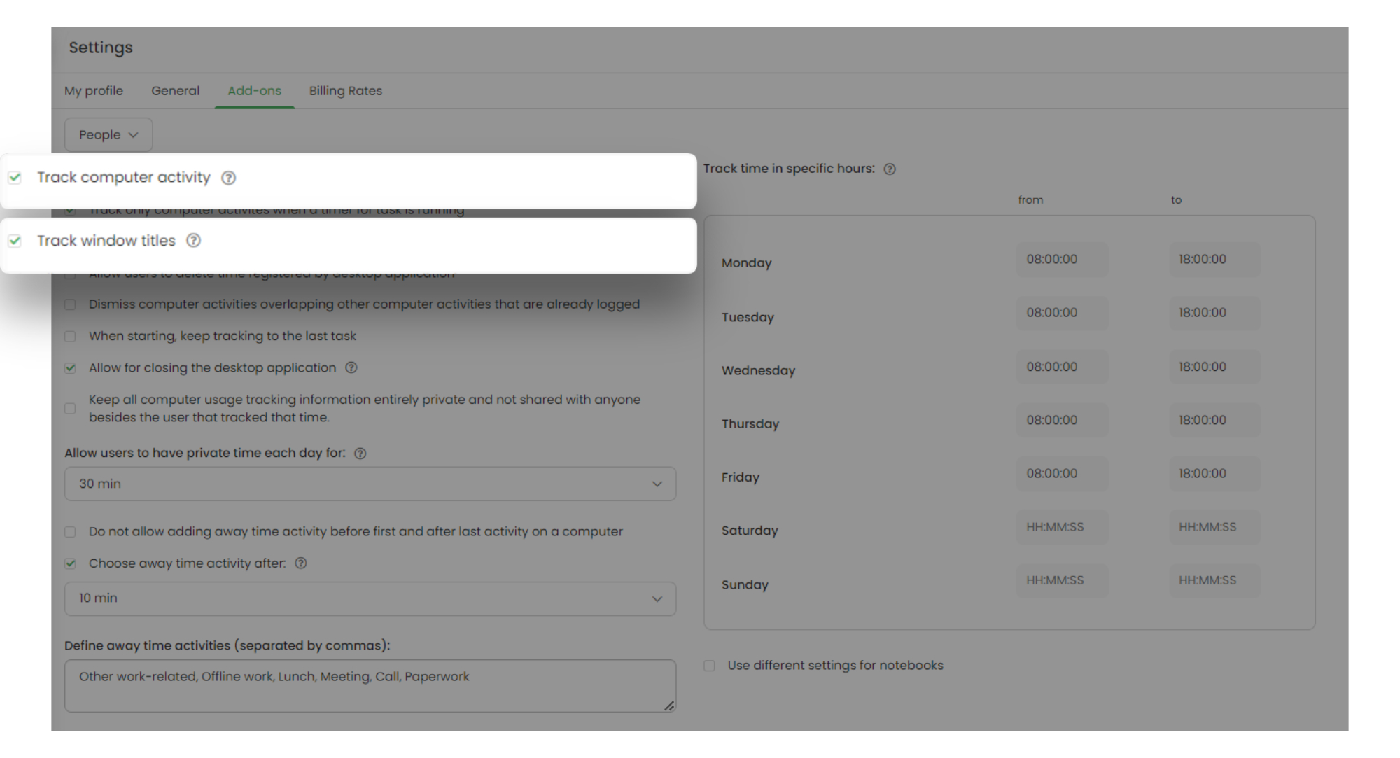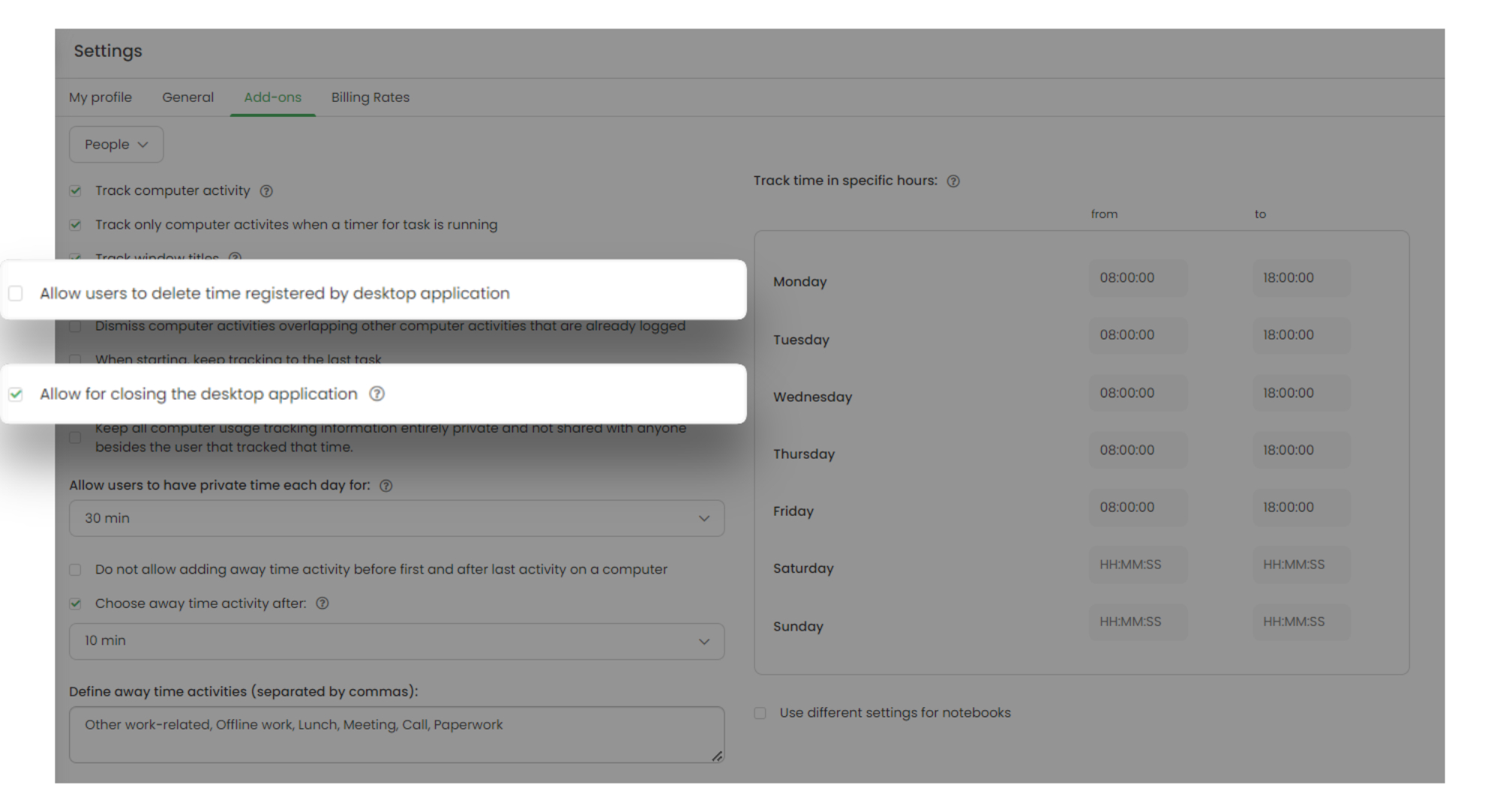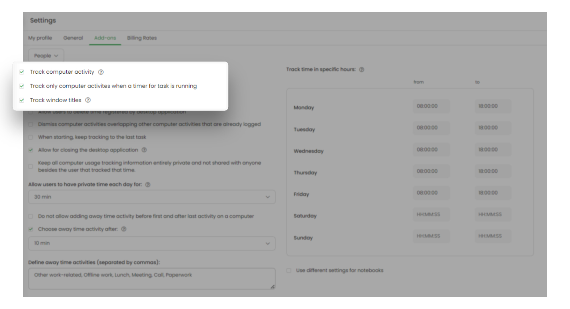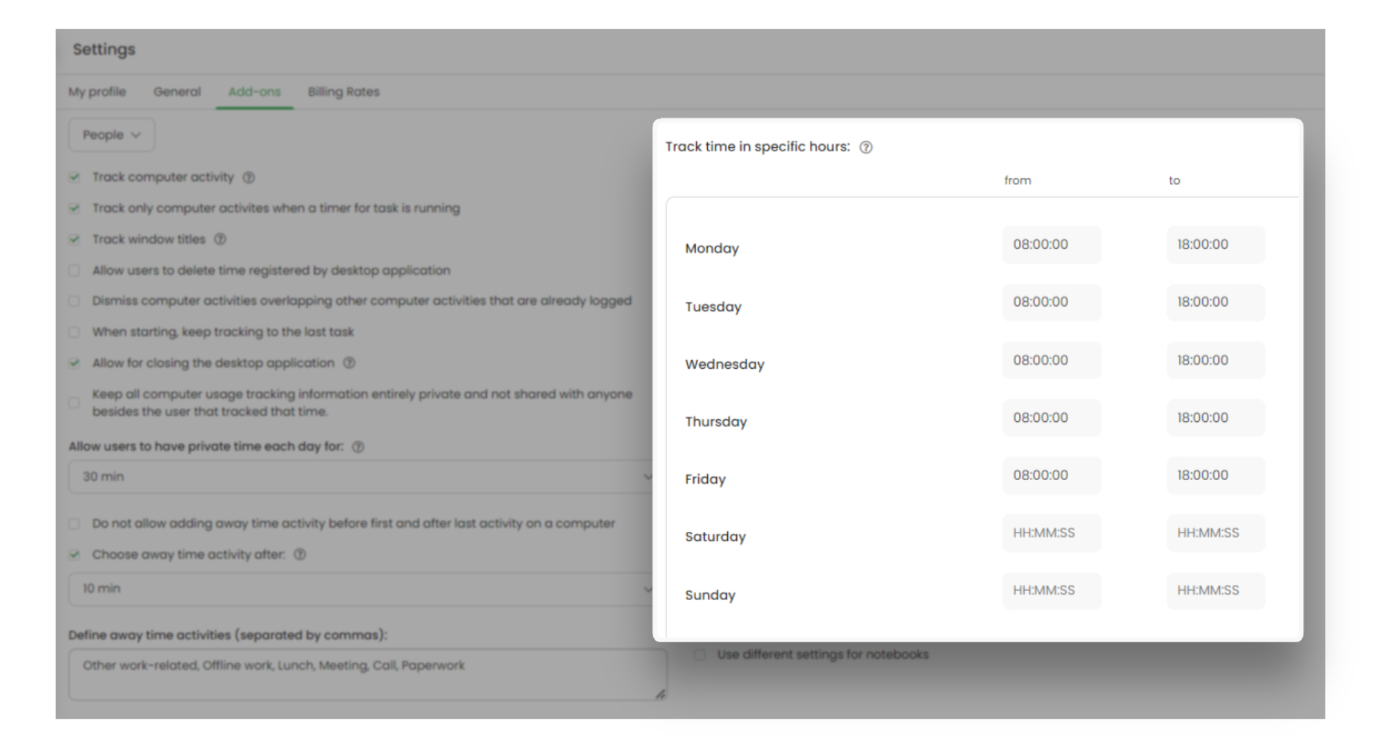 Track time in specific hours - define working hours when the desktop app should track computer time and activities. The application will not register any data before or after the defined hours.