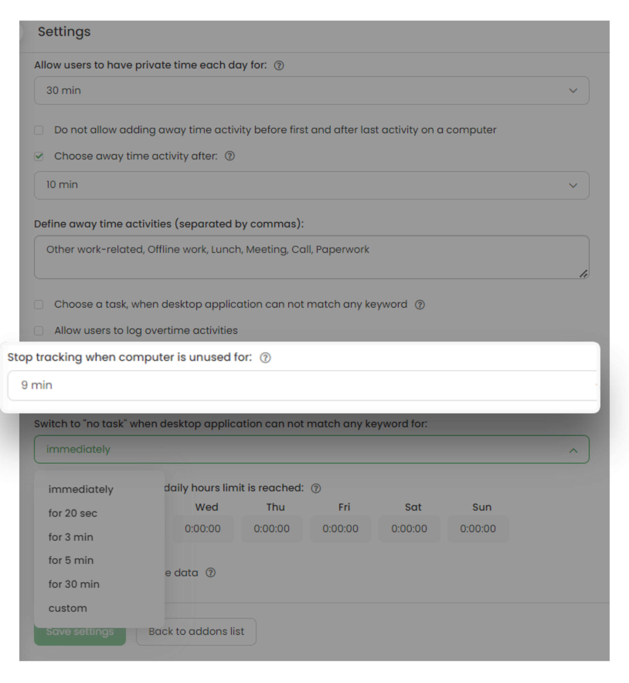 Stop tracking when computer is unused for - if the computer is unused for a certain time, e.g. 5 minutes, the desktop app will stop recording time and activities. This time will be added as the away time.