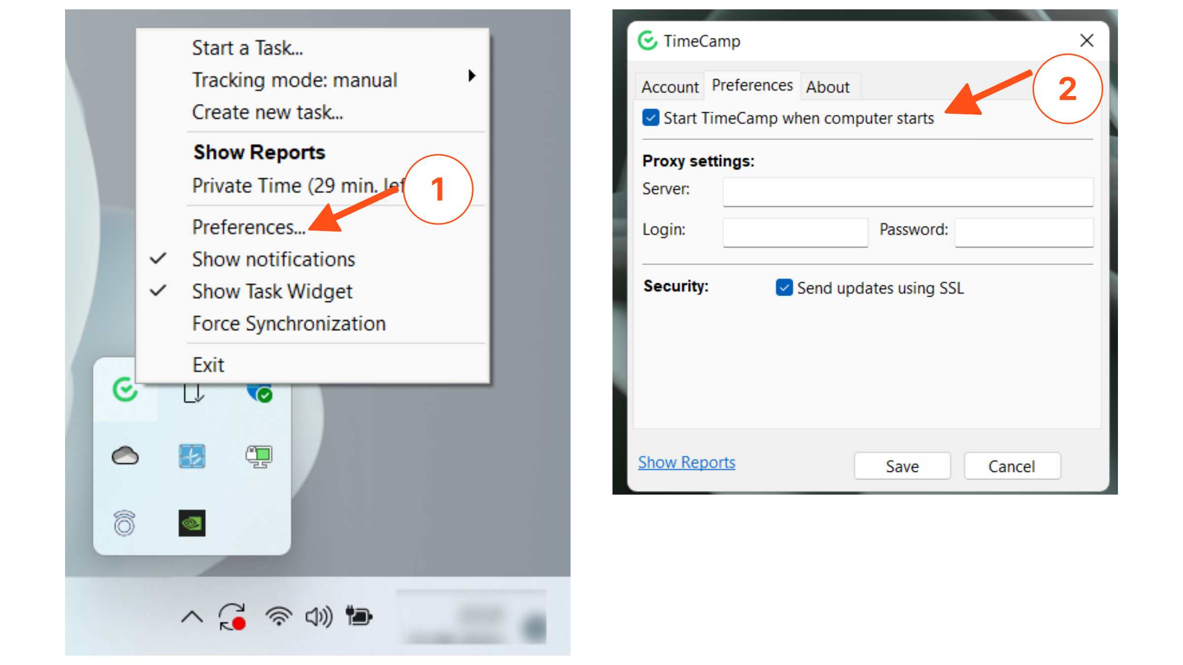 Start TimeCamp when computer starts - the default setting which will be applied if you don't define the specific tracking hours or don't enable the option "Track only computer activities when a timer for task is running". This setting can be modified only within the desktop app menu. Click on the TimeCamp icon (right-click for Windows) and go to Preferences/Options. The administrator’s password is required to get to the preferences menu.