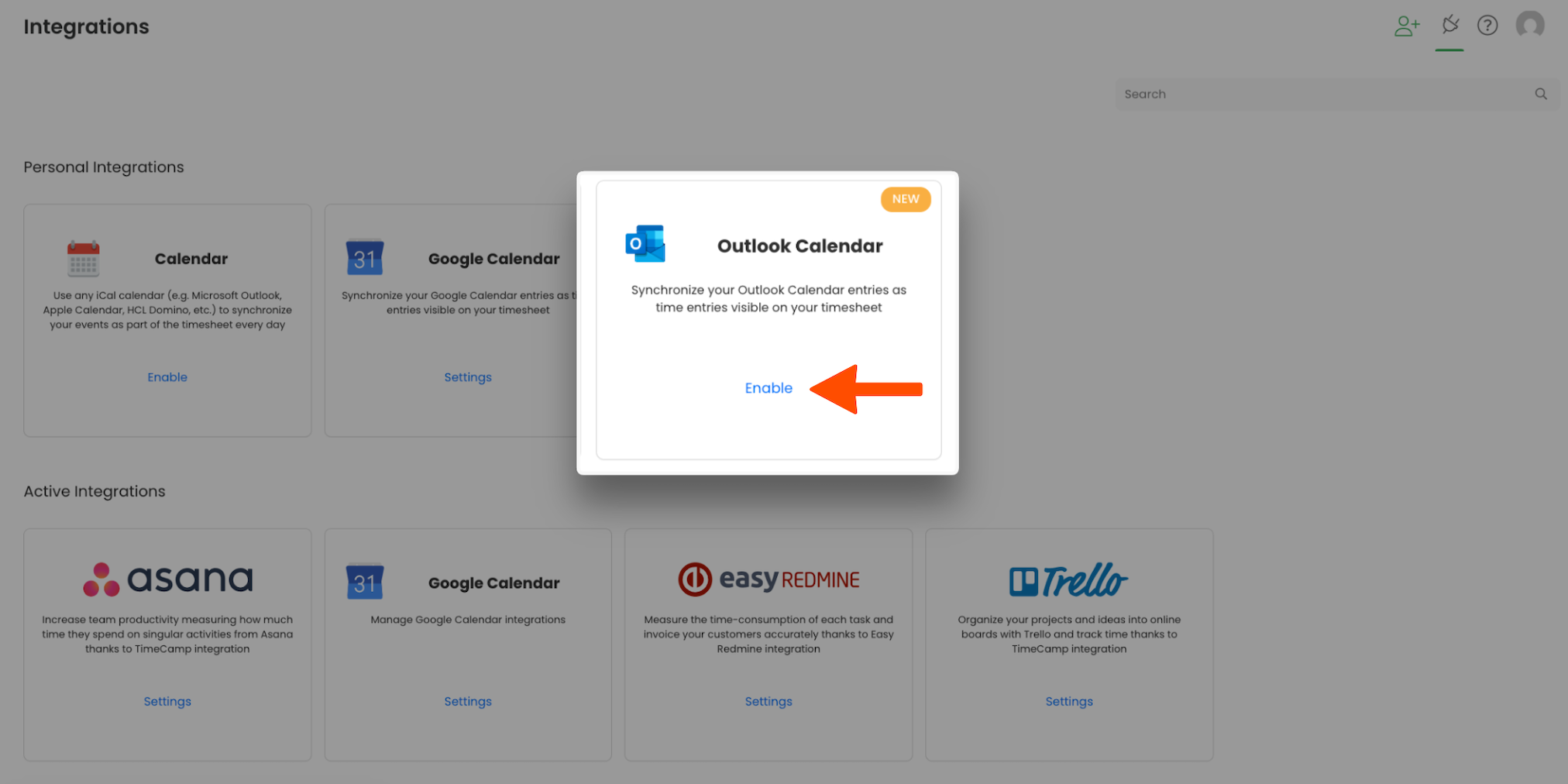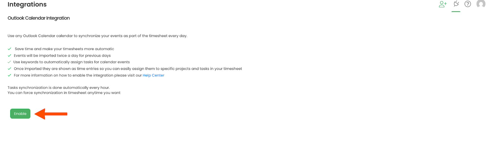 To enable the Outlook Calendar integration, please navigate to the plugin icon and select the Integrations option. Next, find the Outlook Calendar integration on the list and click the Enable button.