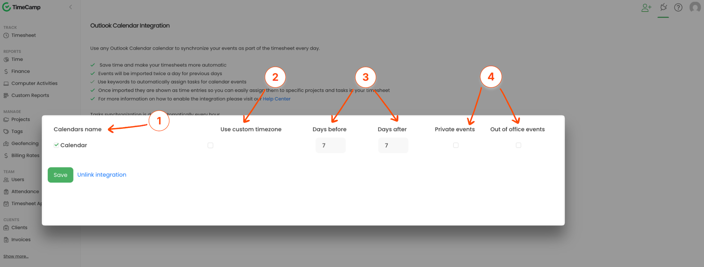 We provide an option to select which calendar from your Outlook account should or should not be imported to TimeCamp. You can select your private calendar, business calendar, holidays, etc. Also, you can define how many days from the past and how many days from the future should be imported.