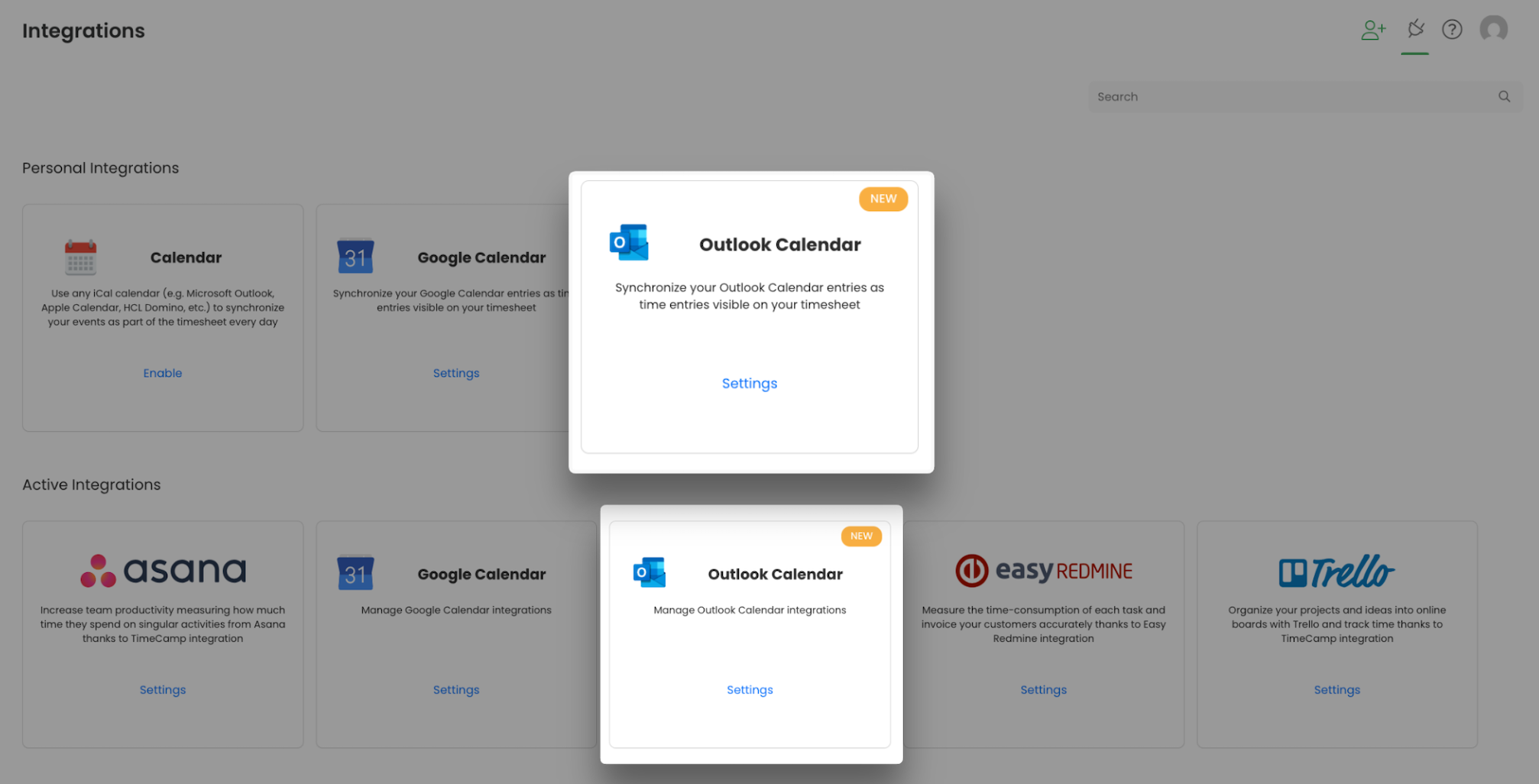Outlook Calendar appears in two sections in the Integrations tab: Personal integrations and Active integrations.