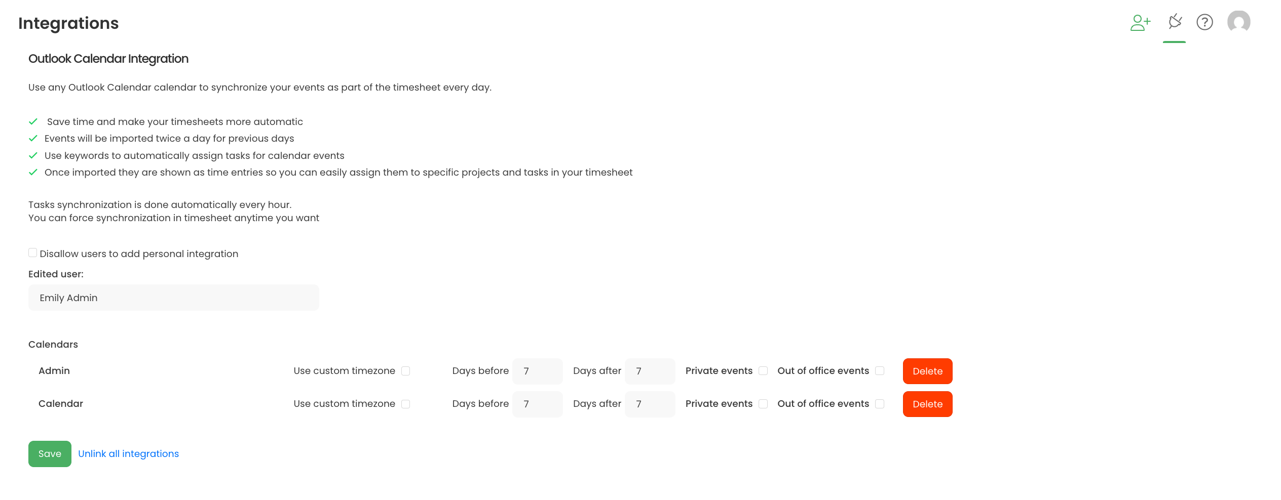 After the integration is enabled you can select a calendar or a few calendars that are connected to your Outlook account and choose the number of days from the past and to the future that you’d like to import to your timesheet on an ongoing basis.