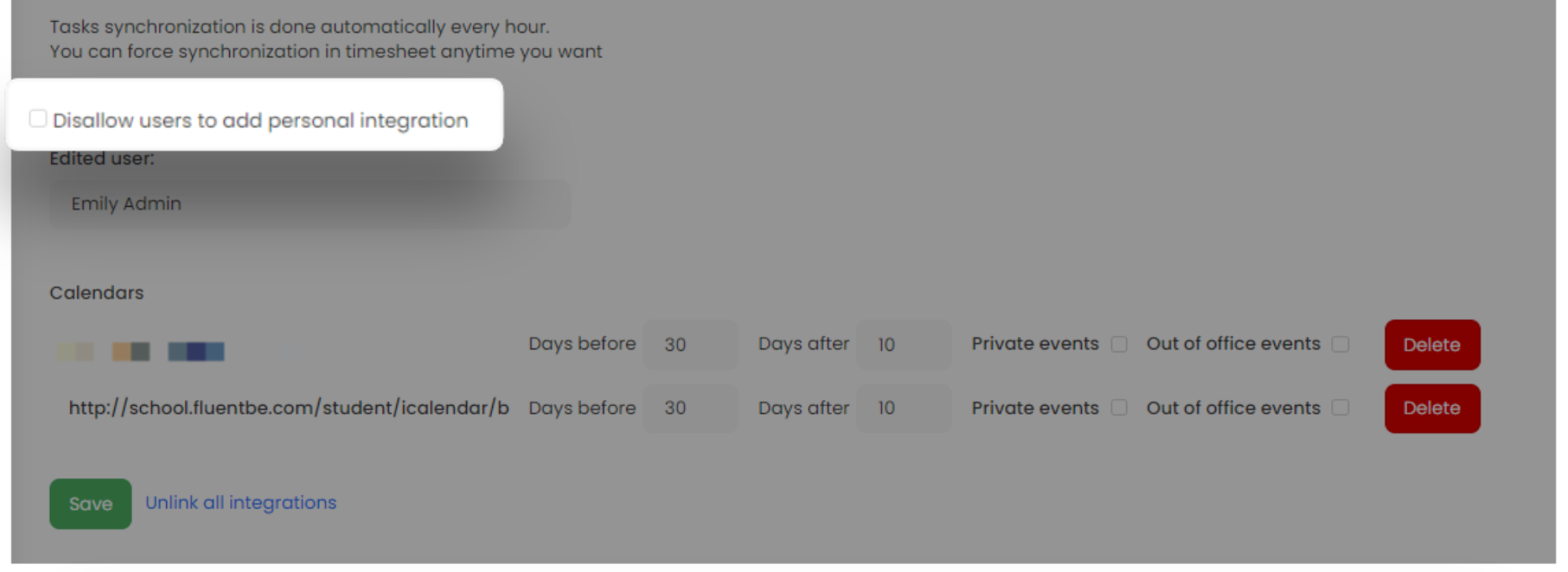 Settings for Outlook Calendar as an account active integration will allow you to view and remove the calendars of other users. Here the Account Administrator can simply select a user from the list, check what calendar is connected, and delete it. After applying any changes, please click on the Save button.