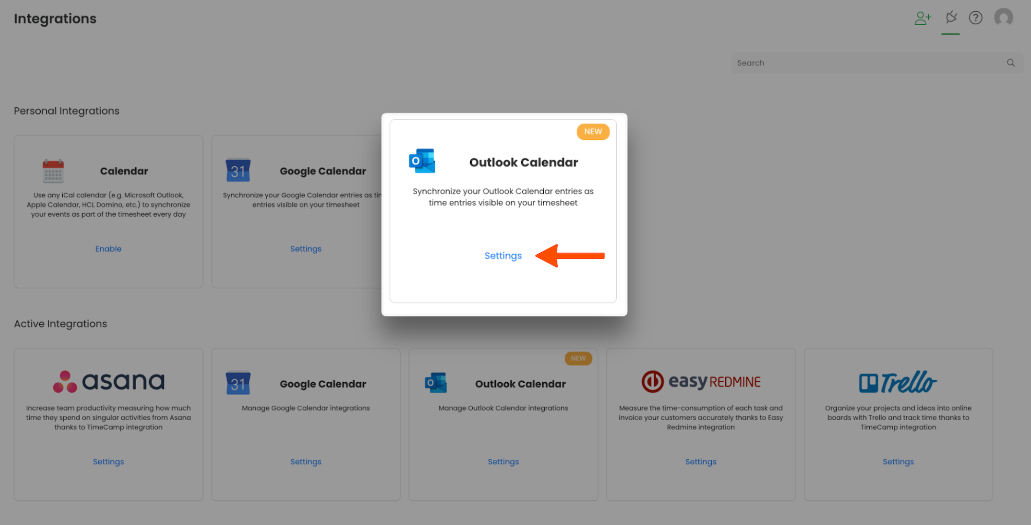 If for some reason you would like to re-enable or unlink the integration please navigate to the plugin icon and select the Integrations option. Next, find the Outlook Calendar integration on the list of personal integrations and click on its Settings.