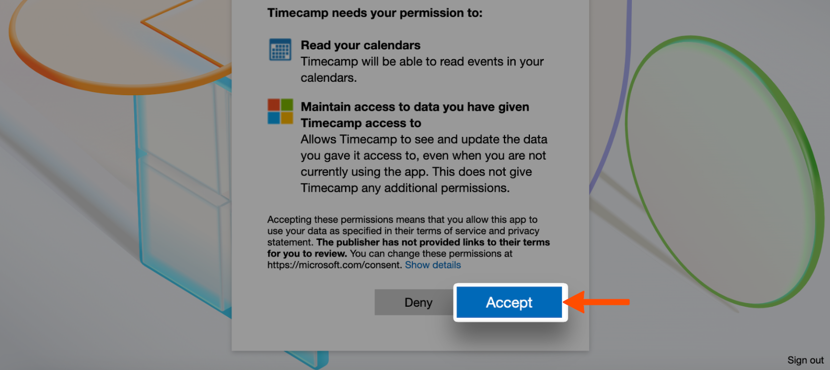 You will be redirected to a new window in order to choose the Outlook calendar you’d like to synchronize with TimeCamp, or log in if you are not logged into any account. After that, press the Accept button to grant the access.