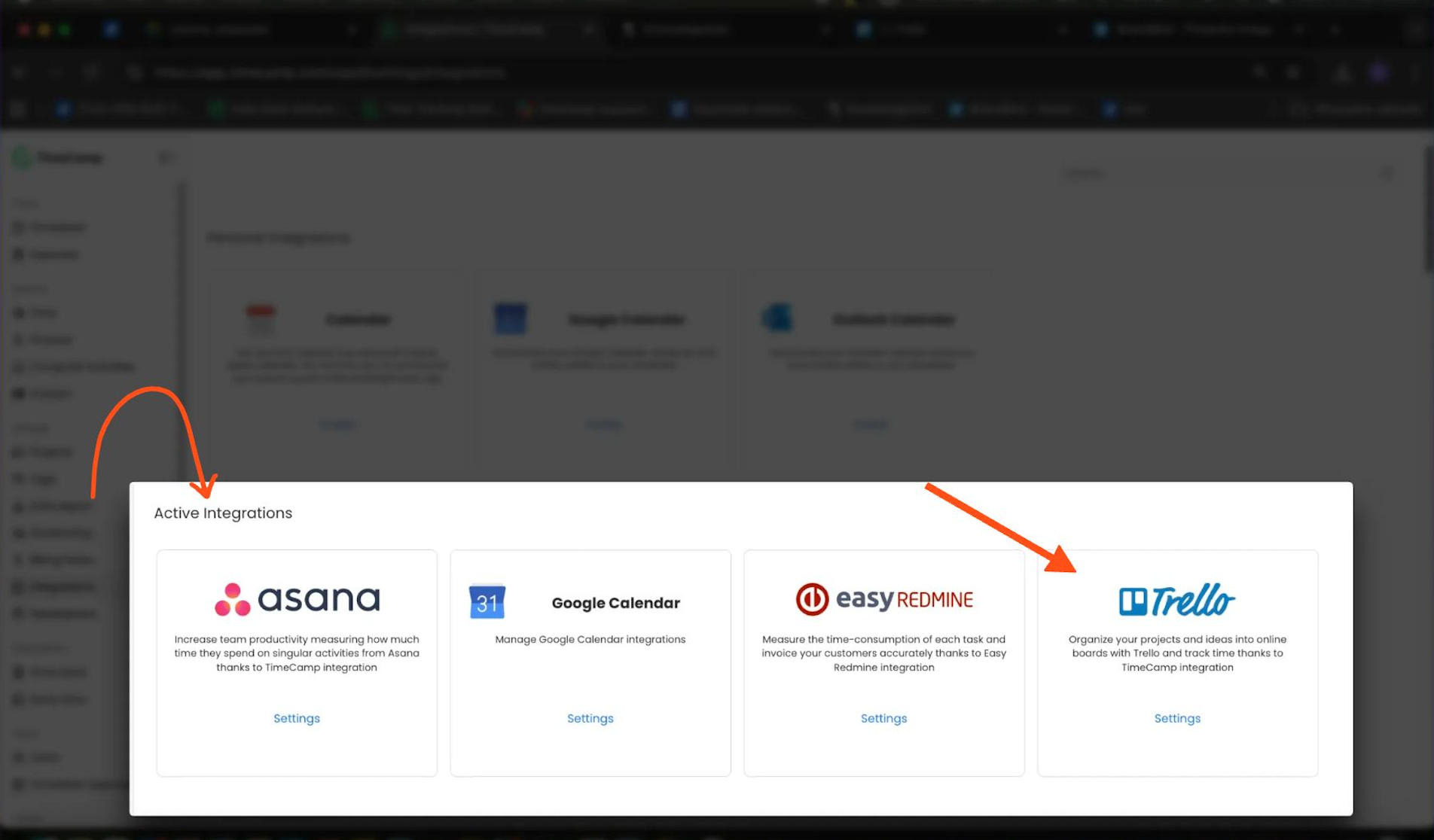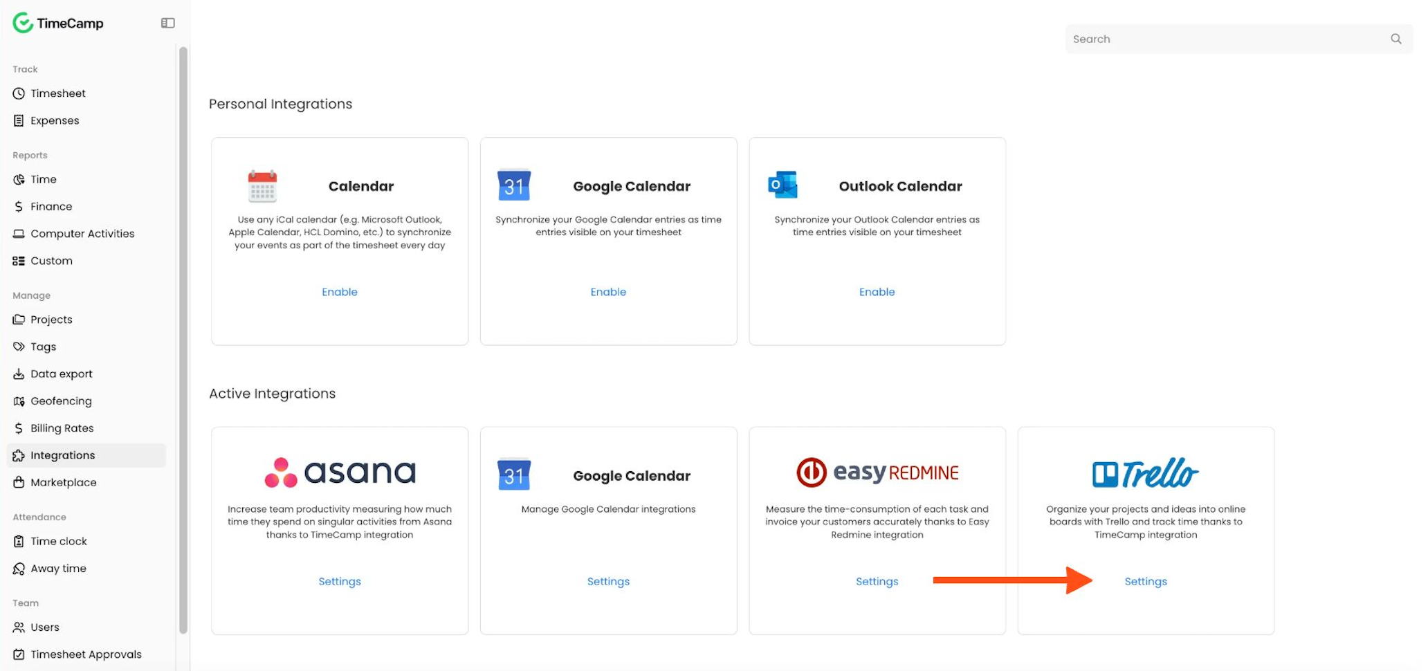 - Find Time Tracker by TimeCamp on the list and click on its Settings;