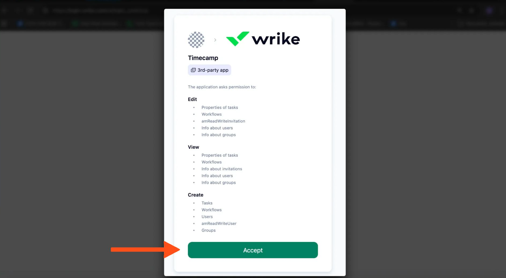 You’ll be redirected to the Wrike website and asked to authorize TimeCamp access to your account. Proceed with authorization by clicking on the Accept button.